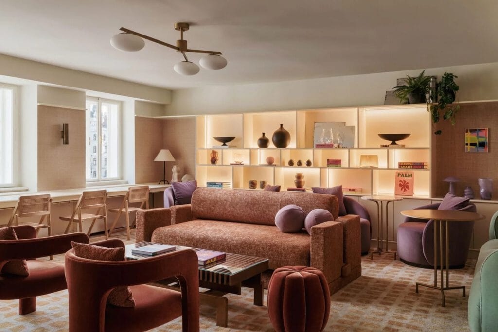 The whole hotel exhales a deep warm feeling. This sensation was achieved thanks to the custom-made furniture, the use of wallpaper and its design, several art collection objects, and especially the combination of rough and soft textures, such as ceramics and bronze, natural stone, velvet, linen, and silk. Another vital element for this room to float in harmony is logically the color scheme. This feature is definitely well-thought. Even though it has diverse colors, they all belong in the same art deco style and float between remarkably similar tones and vibes, creating an overall pink environment.