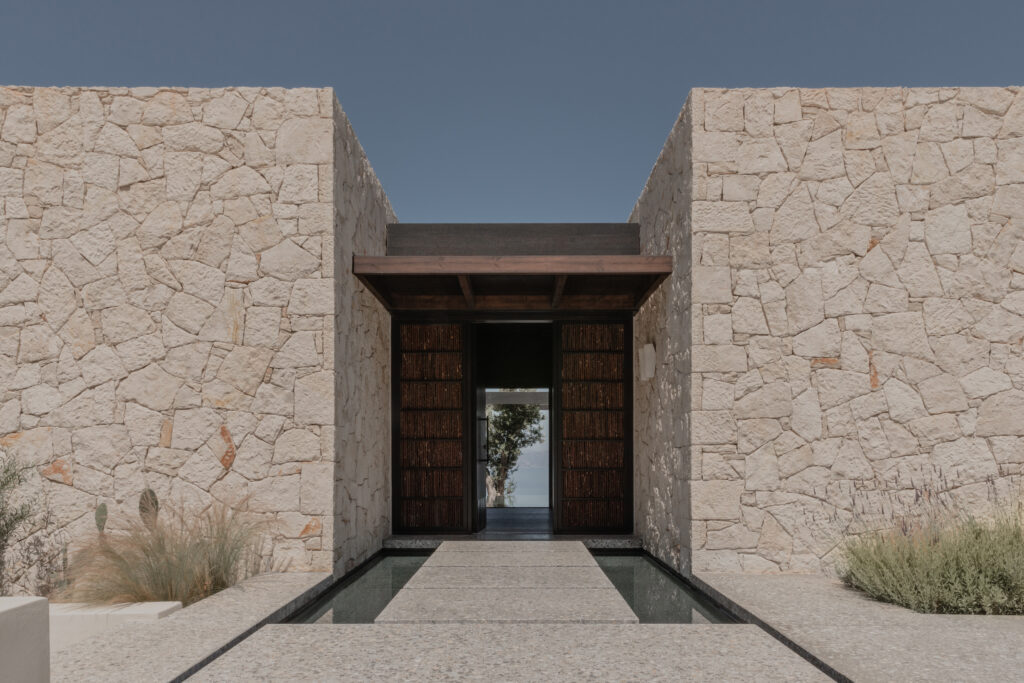 The powerful Greek sunlight helps define shapes and surfaces, playing with the textured materials, as the architects drew on the feel and rhythm of the context for both interiors and exteriors. The journey of light and the clients’ habits throughout the day led the spatial arrangement inside. Each section and route are carefully planned to support functionality and frame vistas, through visual journeys and spatial narratives that blend inside and outside, the natural and the human made. The design seeks to enhance slow living, taking its cues from the island’s lifestyle.