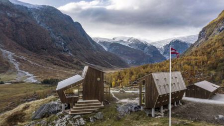 Spektakuläre Architektur, die noch dazu nachhaltig gebaut ist, verortet man meist im urbanen Raum. Im norwegischen Hochgebirge findet man neuerdings ein Stück zeitgenössische Architektur, das nur über einen langen Fußmarsch zu erreichen ist. Auf einem Plateau am Fuße des Jostedalsbreen, Europas größtem Festlandsgletscher, liegt Tungestølen. Eine Formation an Schutzhütten, die weit mehr zu bieten hat als die übliche Wandererbewirtung samt angeschlossenem Matratzenlager. Nicht umsonst stammt der Entwurf von Snøhetta, einem der weltweit renommiertesten Architekturbüros. Auftraggeber ist Luster Turlag, ein regionaler Ableger der Norwegian National Trekking Association.