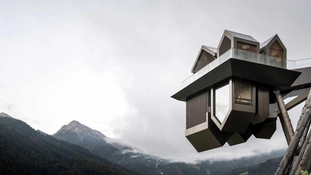 Die Architekten von noa* haben das Alpenhotel Hubertus in Südtirol um einen Wellnessbereich erweitert, der unter dem Titel Hub of Huts die Welt auf den Kopf stellt.