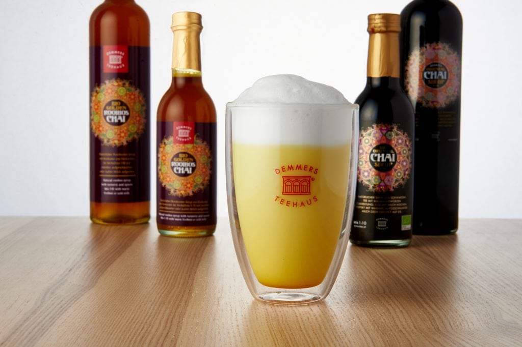 Denn dieser Chai basiert auf koffeinfreiem Rotbusch statt auf schwarzem Tee, bietet jedoch ein ebenso würziges Geschmacks- erlebnis wie Demmers Bio Oriental Black Chai, zusätzlich verfeinert mit Kurkuma, der sogenannten „Gelbwurz“. Er lässt sich mit warmer, aufgeschäumter Milch zum goldfarbenen, cremigen Chai Latte aufgießen und verspricht auch bei spätabendlichem Genuss sanfte Nachtruhe. Kenner empfehlen ein Mischungsverhältnis von einem Teil Sirup und zehn Teilen heißer Milch – mit einem Hauch von Zimt auf der Milchschaumkrone.