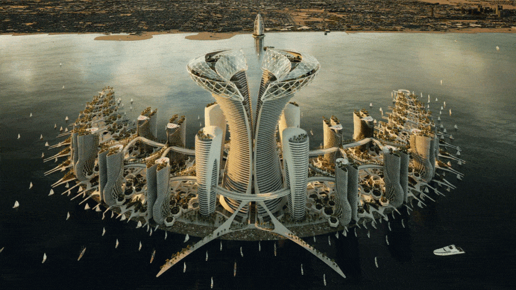 In addition to the central skyscraper, the design calls for fourteen towers to house medical services. At the two ends of the Crescent Island are the hotels. All buildings are symmetrically arranged on both sides of the central skyscraper.