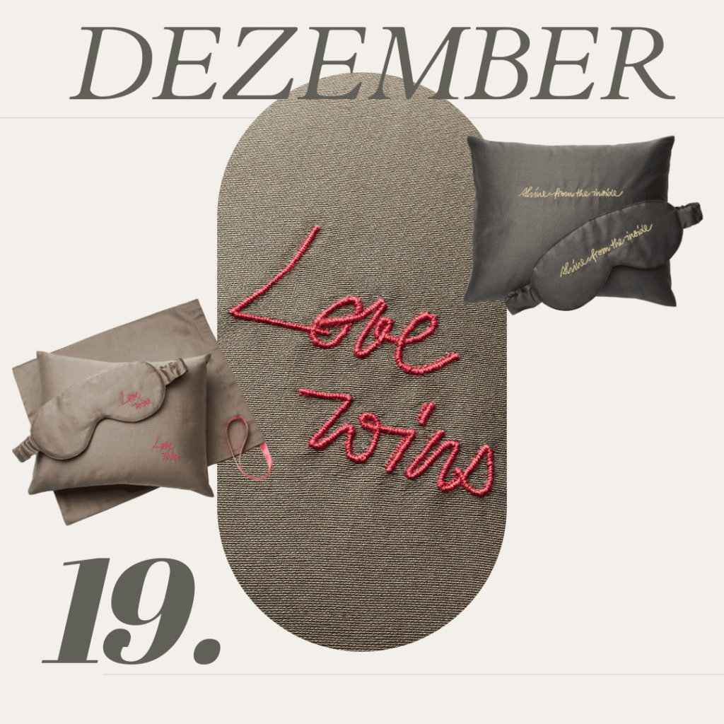 SHINE FROM THE INSIDE und LOVE WINS als liebevoll erinnernde Botschaften an die wirklich wichtigen Werte im Leben. In aufwändiger Nadelmalerei, von Hand geführt, auf Feinsatin aus 100% Giza-Baumwolle gestickt. Die Traveller Sets mit Kissen und Schlafmaske von EGE Textilmanufaktur und SOIS BLESSED sind im Türchen Nummer 19 versteckt – für jeden, der gerne stilvoll reist und sich dabei etwas entspannten, leisen Luxus gönnen möchte. Viel Spaß beim Mitmachen!