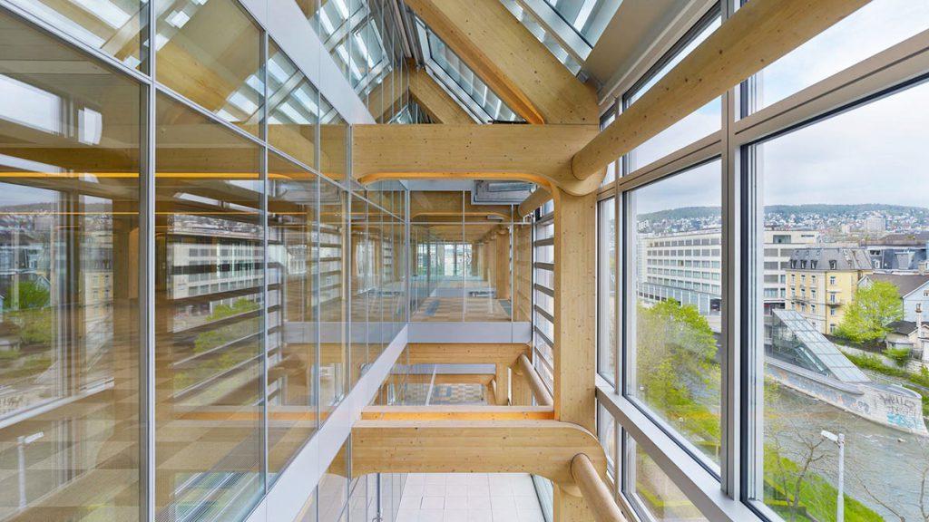 Two years after the office building was completed, the fire protection regulations in Switzerland were changed. Since then, buildings of any class can be built there, even above the high-rise limit. One example is the Rocket wood hybrid skyscraper, which is currently being built in Winterthur’s Lokstadt district and is aiming for a height of 100 meters.