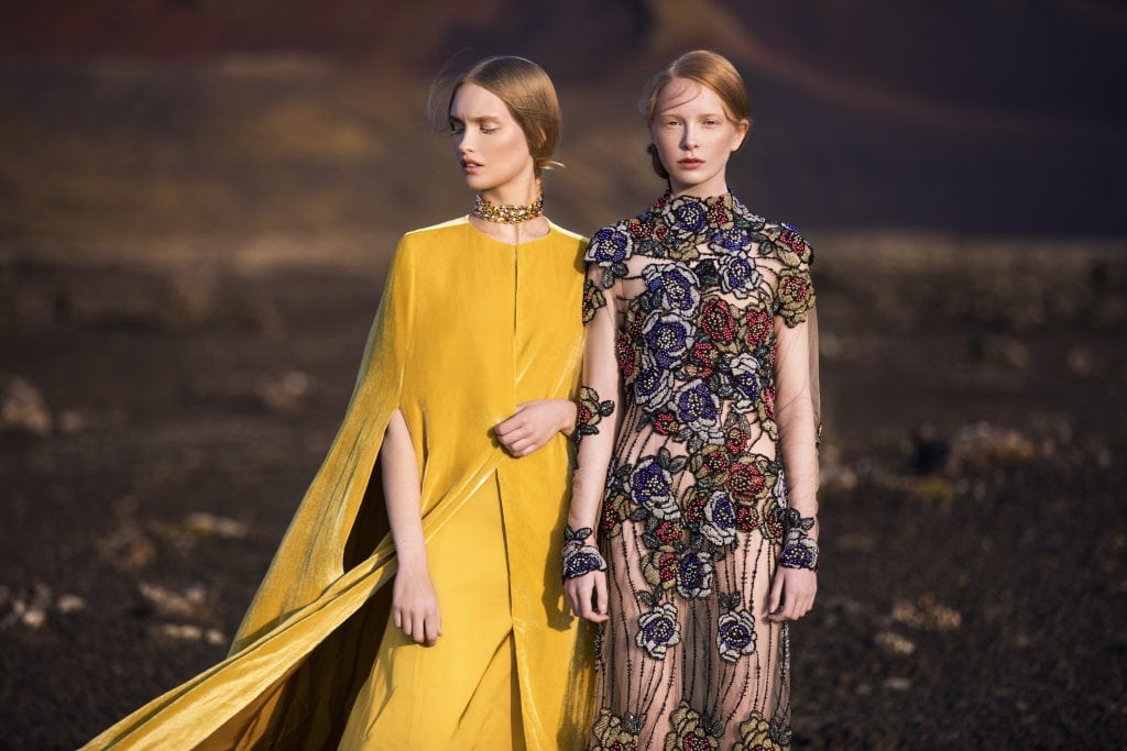 Geshootet wurde in Landmannalaugar, einem der malerischsten Orte Islands. Die international erfolgreiche Designerin genoss die magische Stille, die an diesem sagenumwobenen Ort herrscht. Die wunderbar intensiven Farben Islands wie Blutrot, Tiefgrau oder Senfgelb kom- binierte Eva auf faszinierende Weise mit den Pastelltönen Rosé, Beige, Silbergrau oder sanftem Grün. In feinster Handarbeit wurden verschiedene Materialien wie Samt, Leder und Seide sowie Elemente aus Tüll zusammengeführt. Highlights sind immer wieder ihre aufwendig ausgeführten Stickereien und funkelnden Kristallsteine.