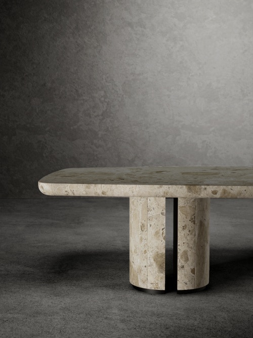 Balanced integration between form and matter, between sensations in the memory and new tactile and visual perceptions that reveal the grace, the minimalist and brutalist design of the For No One table comes from the choice of a raw and organic material such as natural stone, ambrosia marble, which the designer transforms into a sculptural object. The solidity of the stone, reinforced by the firm thickness of the top, is combined with the robust structure of the legs – semi-circular monoliths that gently soften the features – which are combined with the graphic touch of a hoof in matt black metal.