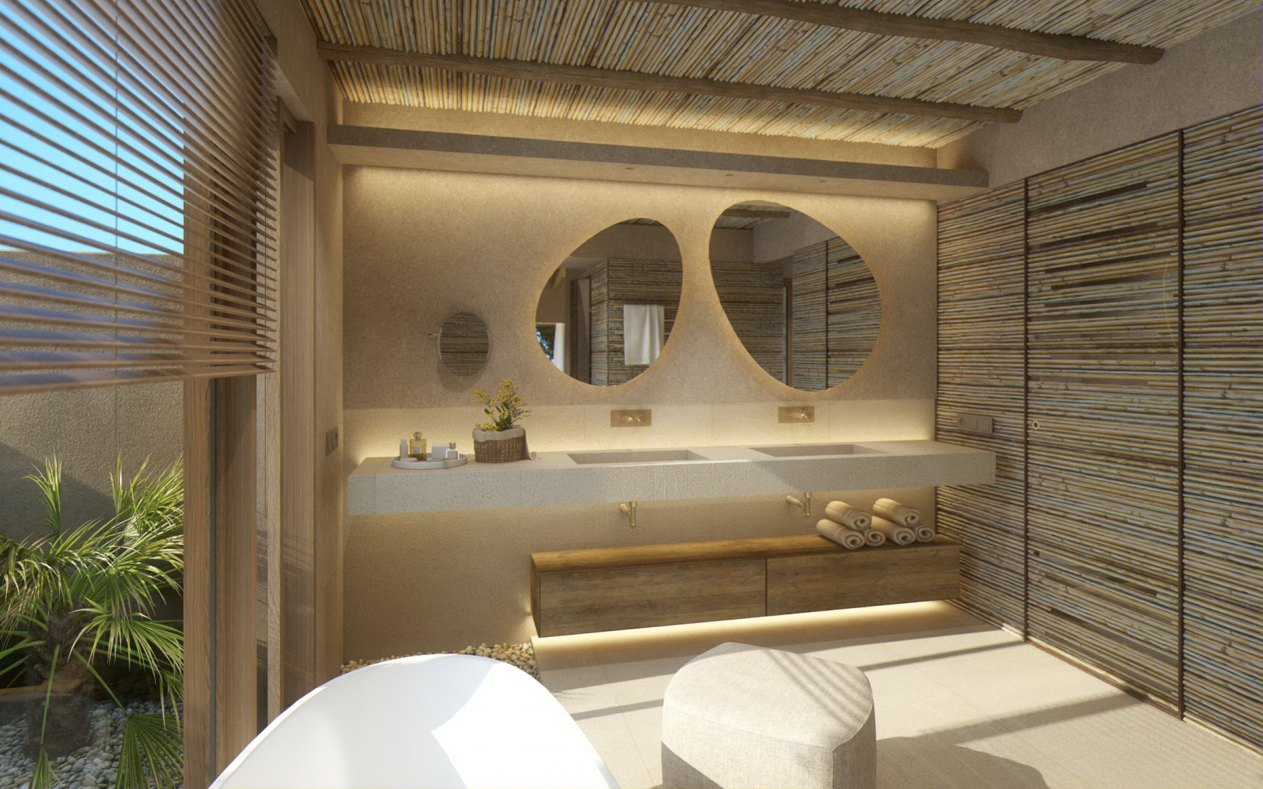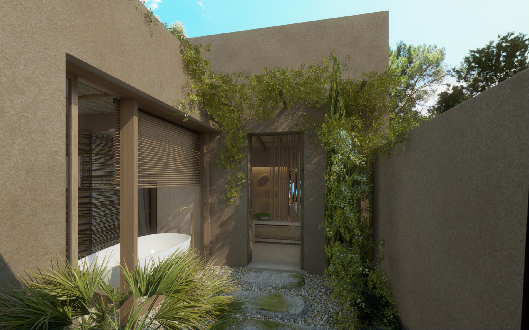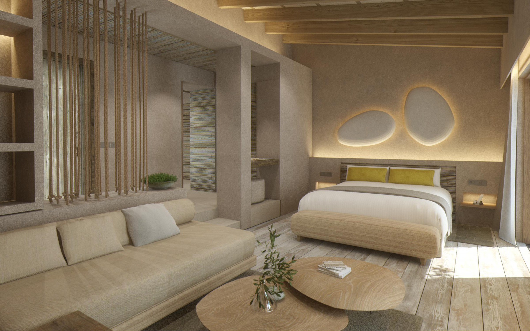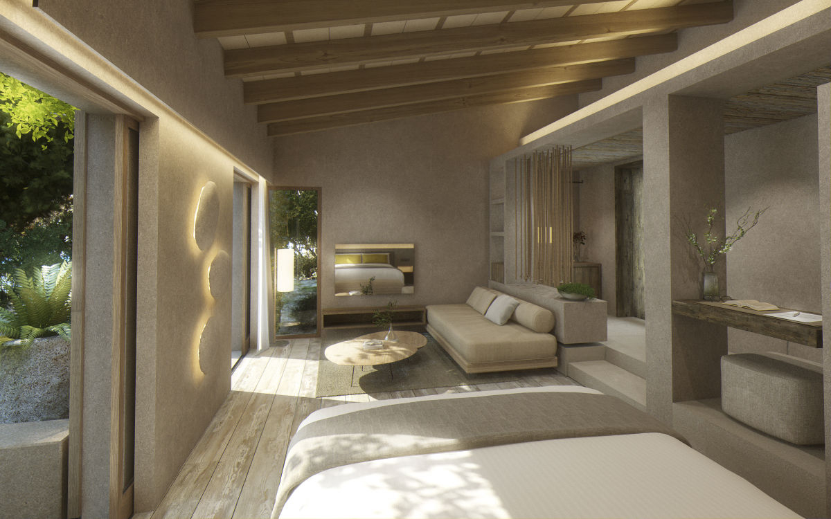 Es gibt fünf verschiedene Arten von Suiten – jede ein Haus für sich, alle mit eigener Terrasse, manche auch mit eigenem Innenhof, Jacuzzi oder Pool. Edle Architektur und luxuriös dezente Ausstattung – Sauna, Jacuzzi im Freien, Wellnessbereich mit verschiedensten Massagen und Ganzkörper-Behandlungen inbegriffen.