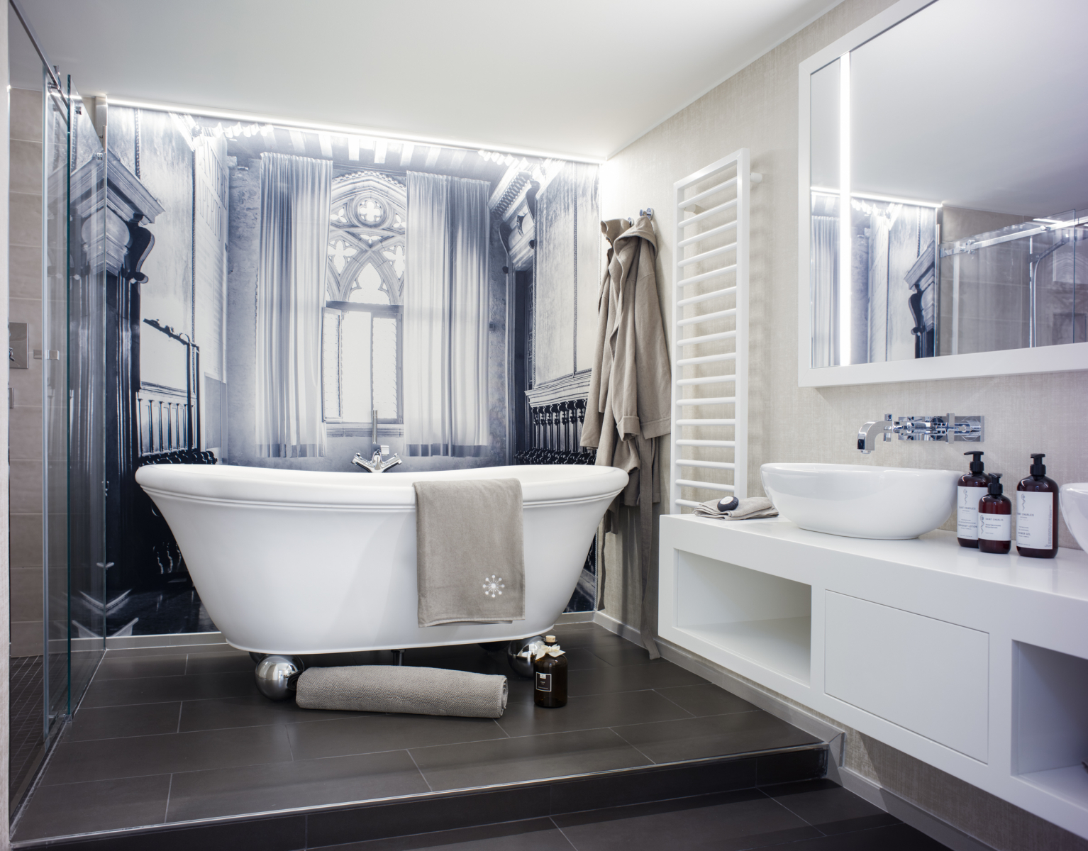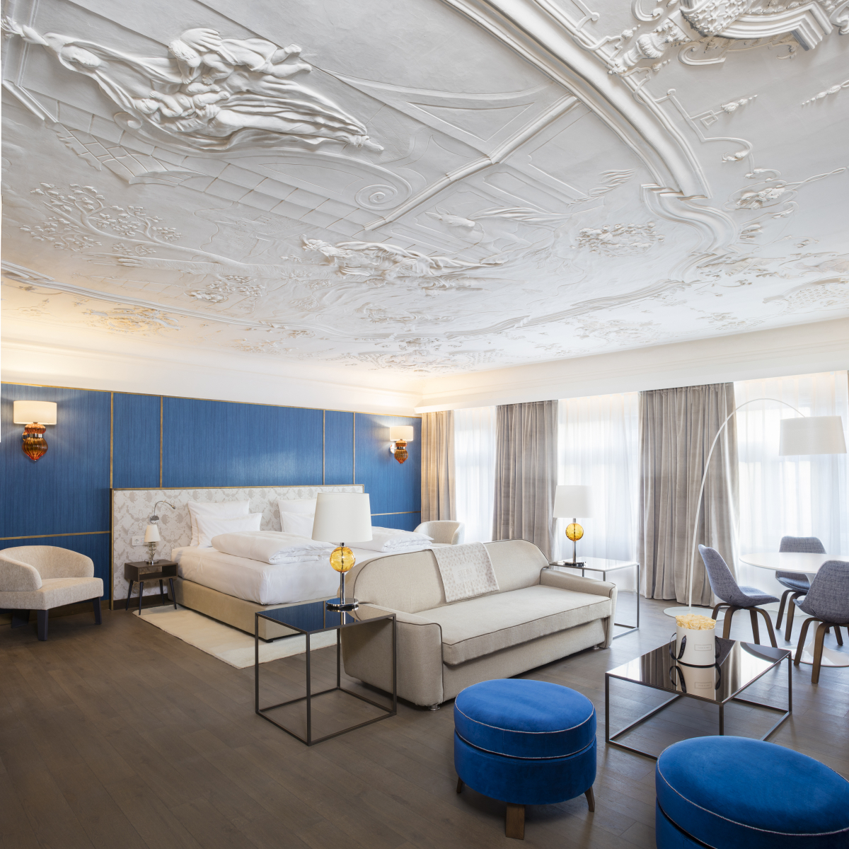 Im Hotel Stein setzt man nun die Tradition der österreichisch-venezianischen Gestaltungskooperation fort. Nicht ohne Grund, denn schließlich ist die traditionsreiche venezianische Glasmanufaktur BAROVIER & TOSO ebenso im Besitz der Eigentümerfamilie des Hotels. So schläft und bewegt man sich nun unter speziell für das Hotel angefertigten Leuchten, Lüstern und Glaskunstwerken, zum größten Teil in Blau als Referenz auf die Lagune, aber auch den Himmel. Die farbenfrohen Stoffe, die sich extrem positiv auf Laune und Gemüt auswirken, stammen aus dem in Venedig ansässigen Stoffhaus Rubelli. Die Städte ins Haus geholt hat man sich mit den großflächigen Fotografien des Kunstfotografen Luigi Caputo. Im Bad findet man die Produkte der Marke Saint Charles, die nach dem Motto „Right to the Roots“ Kosmetik in reinster Form, naturbelassen und in Apothekerqualität, zum Kultobjekt erhoben hat. Zum Mitnehmen gibt es sie im coolen Conceptstore des Hauses gleich am Empfang.