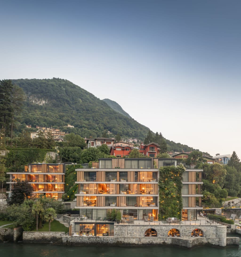 Aussen und innen wurden nur aus der Region stammende Materialien verwendet, darunter Canaletto-Walnuss für die Zimmerdecken, Verde Alpi für Steinmauern und Ceppo di Gré für die Böden, kombiniert mit venezianischem Terrazzo. Als kreative Anknüpfungspunkte für Textilien und Stoffe dienten die Schal-Dessins der Fünfzigerjahre sowie Landschaftsmotive vom Comer See. Eingerahmt von spektakulären Ausblicken auf den See und die Berge ist das Interieur eine Hommage an das emblematische italienische Design, bestückt mit ausgesuchten Möbeln von Patricia Urquiola. Darunter die Badewanne Lariana und der Fauteuil Ludo, die beide ursprünglich für das Il Sereno entworfen wurden und inzwischen in den Katalogen von AGAPE und Cappellini zu finden sind. Hinzu kommen echte Designklassiker, wie beispielsweise das Infinito-Bücherregal von Franco Albini und der Leggera-Stuhl von Gio Ponti.