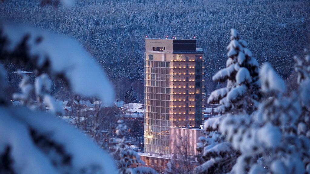 In einem der weltweit höchsten Holz-Hochhäuser in der nordschwedischen Stadt Skellefteå befindet sich The Wood Hotel. Ein neuer Urlaubsmagnet, der von der Landschaft, der Architektur und einer grünen Zukunftsvision profitiert.