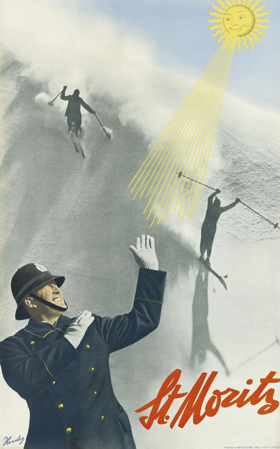 Ein exemplarisches Poster für St. Moritz stammt von Walter Herdeg aus dem Jahr 1934. Herdeg, ein Absolvent der Kunstgewerbeschule Zürich, war in den 1930er Jahren Art-Director für den berühmten Schweizer Skiort. Abstrakte Designs, so Herdegs Überzeugung, würden Menschen nicht ansprechen. In seinen Plakaten wollte er daher eine Atmosphäre voller Sinnlichkeit schaffen, die in den Betrachtern den Wunsch weckt, frische Luft zu atmen, die warme Sonne zu genießen und skizufahren. Herdeg arbeitete mit Fotomontagen, die er mittels Spritzpistolentechnik verfremdete. Erstmals wurde einem Urlaubsort ein Corporate Design verpasst. Noch heute wird Herdegs Markenzeichen, eine hell strahlenden Sonne, verwendet. Sein Poster mit zwei Skifahrern, einer strahlenden Sonne, einem englischen Schutzmann und dem roten Schriftzug St. Moritz wurde für die Auktion auf 4.000 bis 6.000 US-Dollar geschätzt. Ebenfalls versteigert wurden Poster für andere traditionsreiche Skiregionen, etwa Davos, Cortina, den Arlberg und Lake Placid.