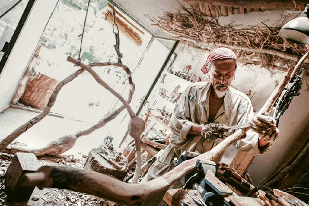 „Alle diese Wälder oder Äste sind hier geboren, sie gehören zu diesem Land und genau deshalb nutze ich sie. Es ist ein Zweig, der zum Beispiel längst nicht mehr lebt. Er ist bereits vertrocknet oder abgestorben, aber seine Biegung hat überlebt. Seine Biegung hat genauso eine Ursache, wie das Leben eines Menschen. Er ist nicht linear, er verzweigt sich, er kreuzt meinen Weg, ein Spross kommt hervor, er sucht die Sonne, er sucht andere Dinge. Ich unterhalte mich mit jedem Zweig und bewundere ihn. Das ist die Art und Weise, wie ich mit dem Material meiner Arbeit umgehe. Es ist eine sehr tiefe Beziehung. Mein Gefühl ist wie diese pflanzliche Materie, die die Kraft des Lebens und ihre Schönheit innehat. Sobald ich ein Werk geschaffen habe, gehört es deswegen auch nicht mehr mir.“