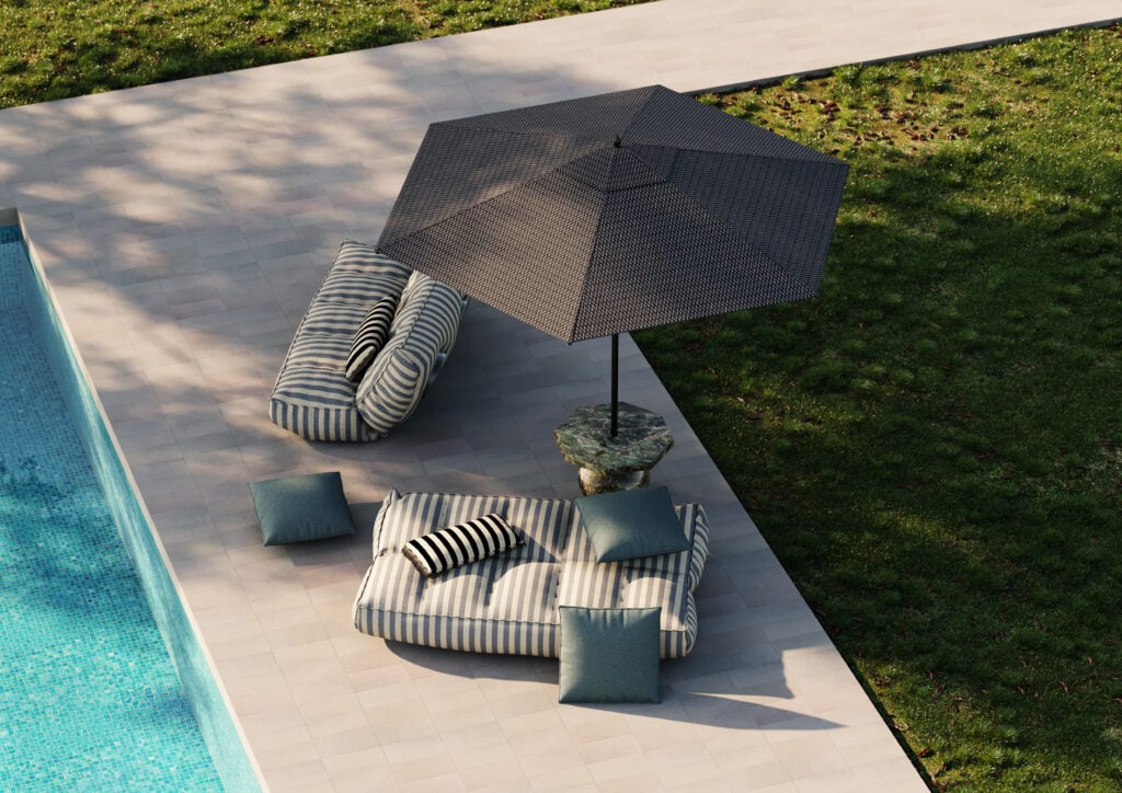 Elektra is a beautiful and multifunctional parasol whose base can be detached from the umbrella, becoming a bold side table used by the pool. Elektra parasol is part of a continuous quest for beautiful parasols that defy the standard models. This piece aims to provide all sun lovers with a luxurious, exquisite ‘Sombrilla.’