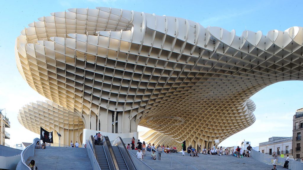 Sieben Jahre und 95 Millionen Euro später hatte die Stadt Sevilla ihr neues Wahrzeichen, den Metropol Parasol. Das Berliner Architekturbüro von J. Mayer H. und Partner schuf damit einen zukunftsweisenden Bau, der zu den größten Holzstrukturen der Welt zählt. Das geschwungene Dach umfasst eine Fläche von 5.000 Quadratmetern und bietet auf einem 400 Meter langen Skywalk Ausblicke über die ganze Stadt.