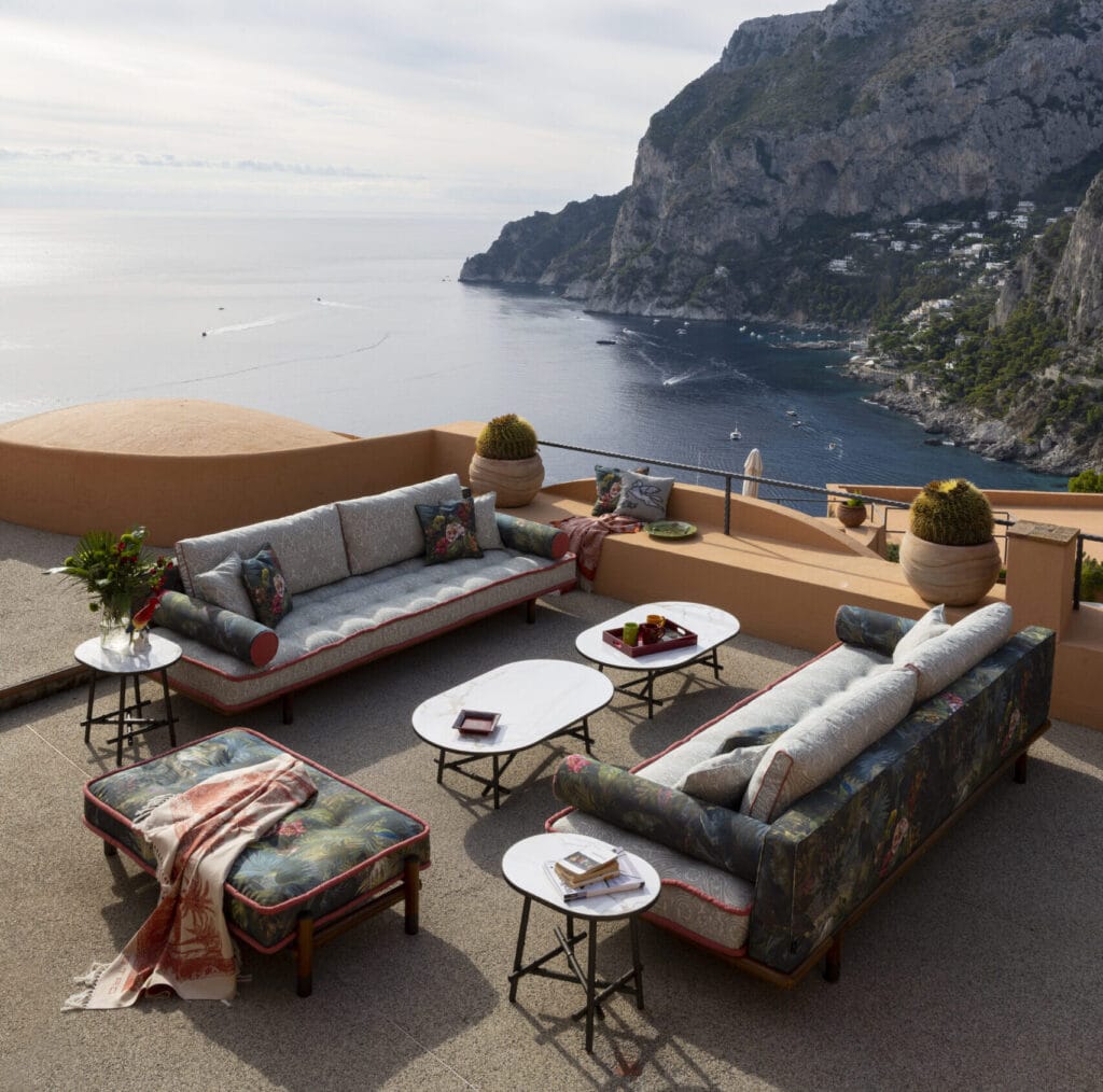 Envisage the deep blue sea, magical nature and timeless beauty of Capri. Overlooking the Marina Piccola bay and Scoglio delle Sirene is the luxury 5-star Punta Tragara Hotel, perched atop the Faraglioni, an awe inspiring location to introduce the new ETRO Home Interiors outdoor collection. Bathed in the atmospheric light of this seductive place, a chaise longue, sofa, chair, tables and poufs decorate the splendid sea view terrace of the hotel’s most prestigious suite, creating an oasis of relaxation with a chic, comfortable allure.