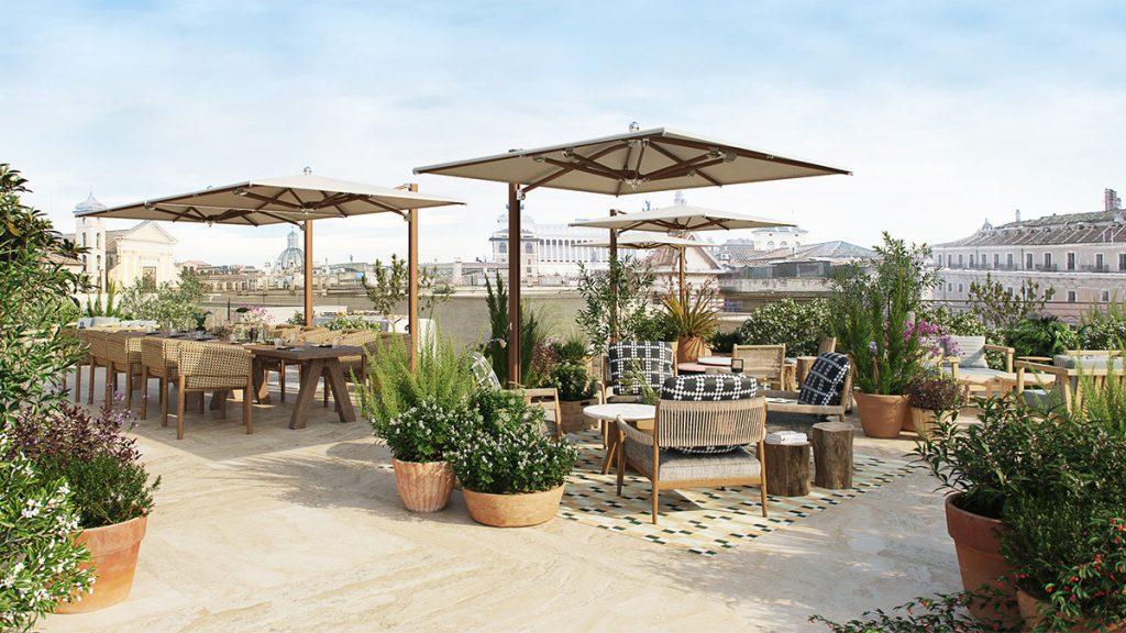 Obwohl im quirligen Herzen Roms gelegen, vermittelt das Stadt-Hotel ein Gefühl der Ruhe und Beschaulichkeit. Fantasievolle Bepflanzung vom Entree bis zur Dachterrasse (siehe Beitragsbild) und natürliches Licht schaffen eine luftig-natürliche Atmosphäre in den weiten offenen Räumen.