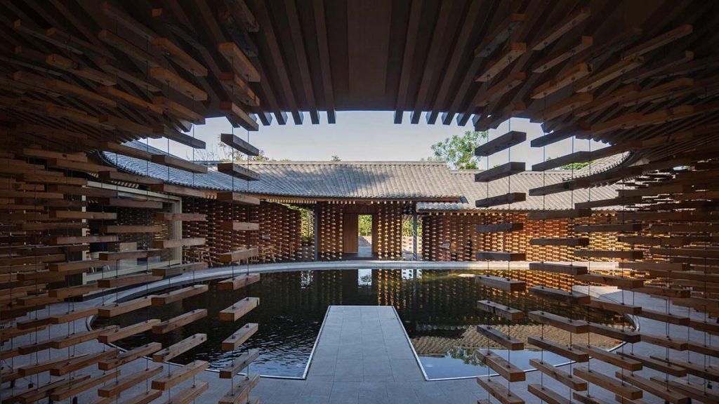 The time of day can be read from the shadows cast by the fanned-out firewood as the sun passes. The passage of time is accompanied by the formation of light and shadow that slowly measures the space and flows across wood, stone, glass and water. “The overlapping and staggering of materials, like a sundial, brings a trace of time into the architectural space,” the architects explain in their project description. “Locality, spatiality and temporality are bridged and spread out in the architectural space through the unique use of materials.”